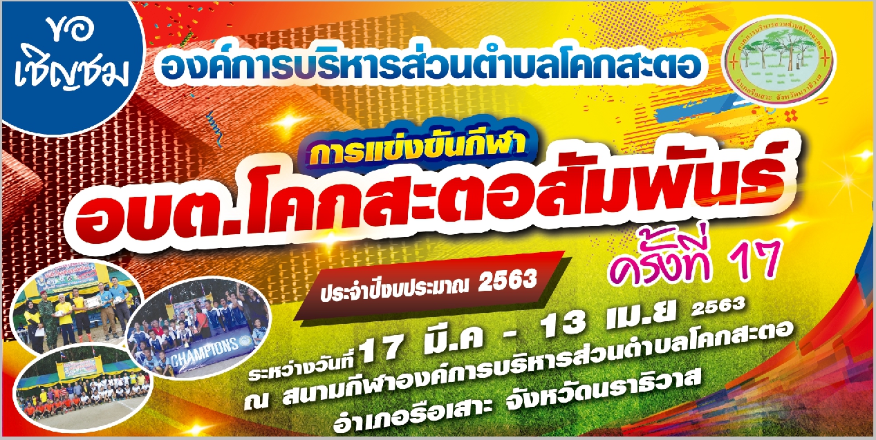 ขอเชิญชวน ชมการแข่งขันกีฬา อบต.โคกสะตอสัมพันธ์ ครั้งที่ 17 ระหว่างวันที่ 17 มีนาคม - 13 เมษายน 2563 ณ สนามกีฬาองค์การบริหารส่วนตำบลโคกสะตอ