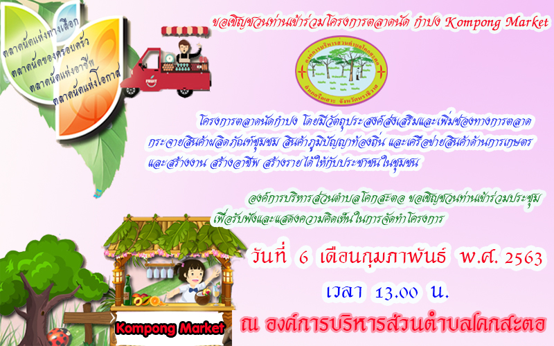 ขอเชิญชวนเข้าร่วมประชุมเพื่อรับฟังและแสดงความคิดเห็นในการจัดทำโครงการตลาดนัดกำปง วันที่ 6 กุมภาพันธ์ 2563 เวลา 13.00น. ณ องค์การบริหารส่วนตำบลโคกสะตอ