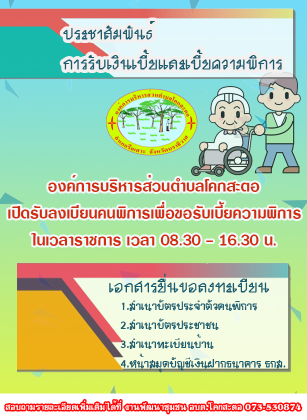 ประชาสัมพันธ์ องค์การบริหารส่วนตำบลโคกสะตอเปิดรับลงทะเบียนคนพิการ เพื่อขอรับเบี้ยความพิการ ในปีงบประมาณ 2564 ในเวลาราชการ ตั้งแต่ 08.30น. - 16-30น.