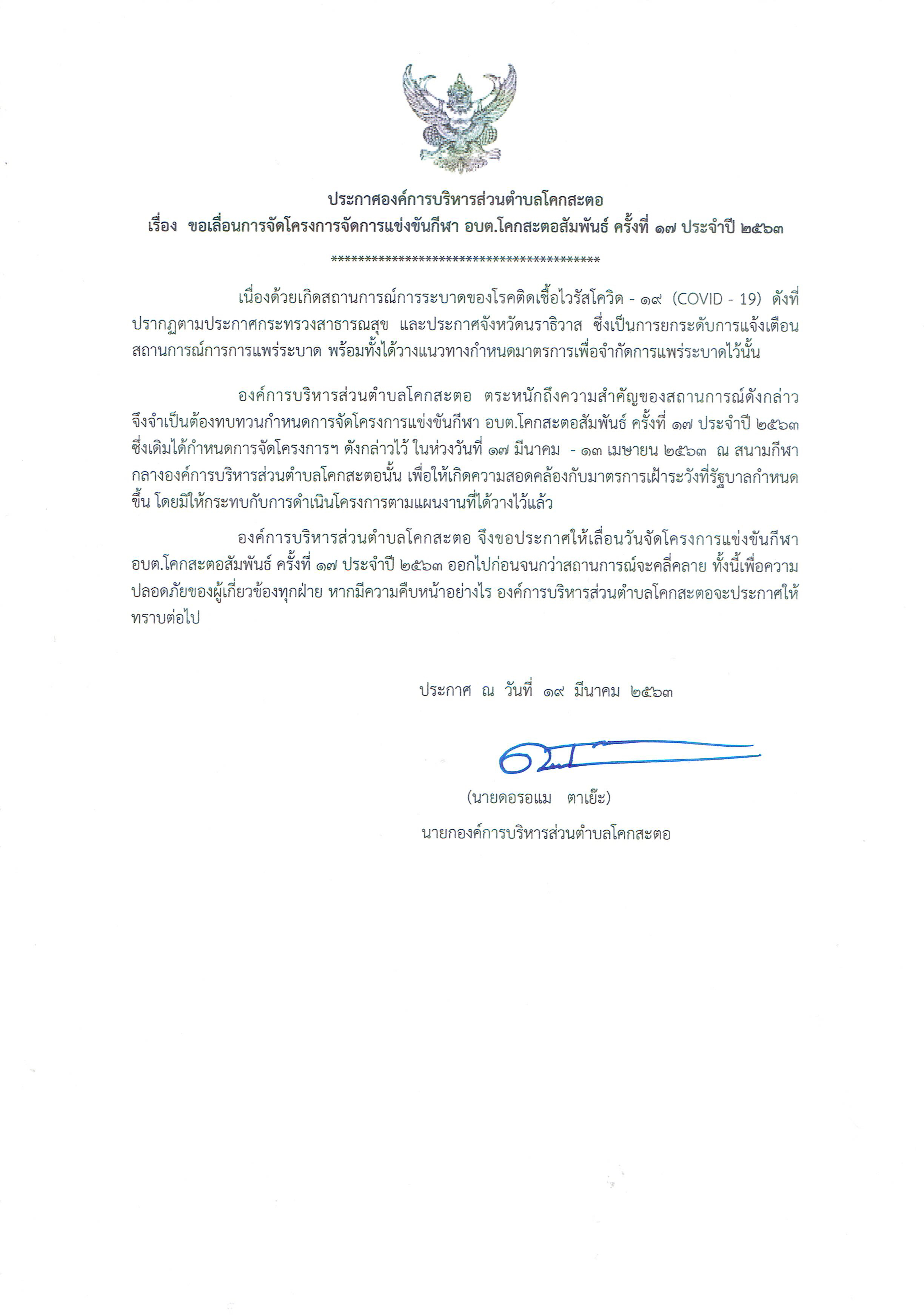 ประกาศ ขอเลื่อนการจัดการโครงการจัดการแข่งขันกีฬา อบต.โคกสะตอสัมพันธ์ ครั้งที่ 17 ประจำปี 2563