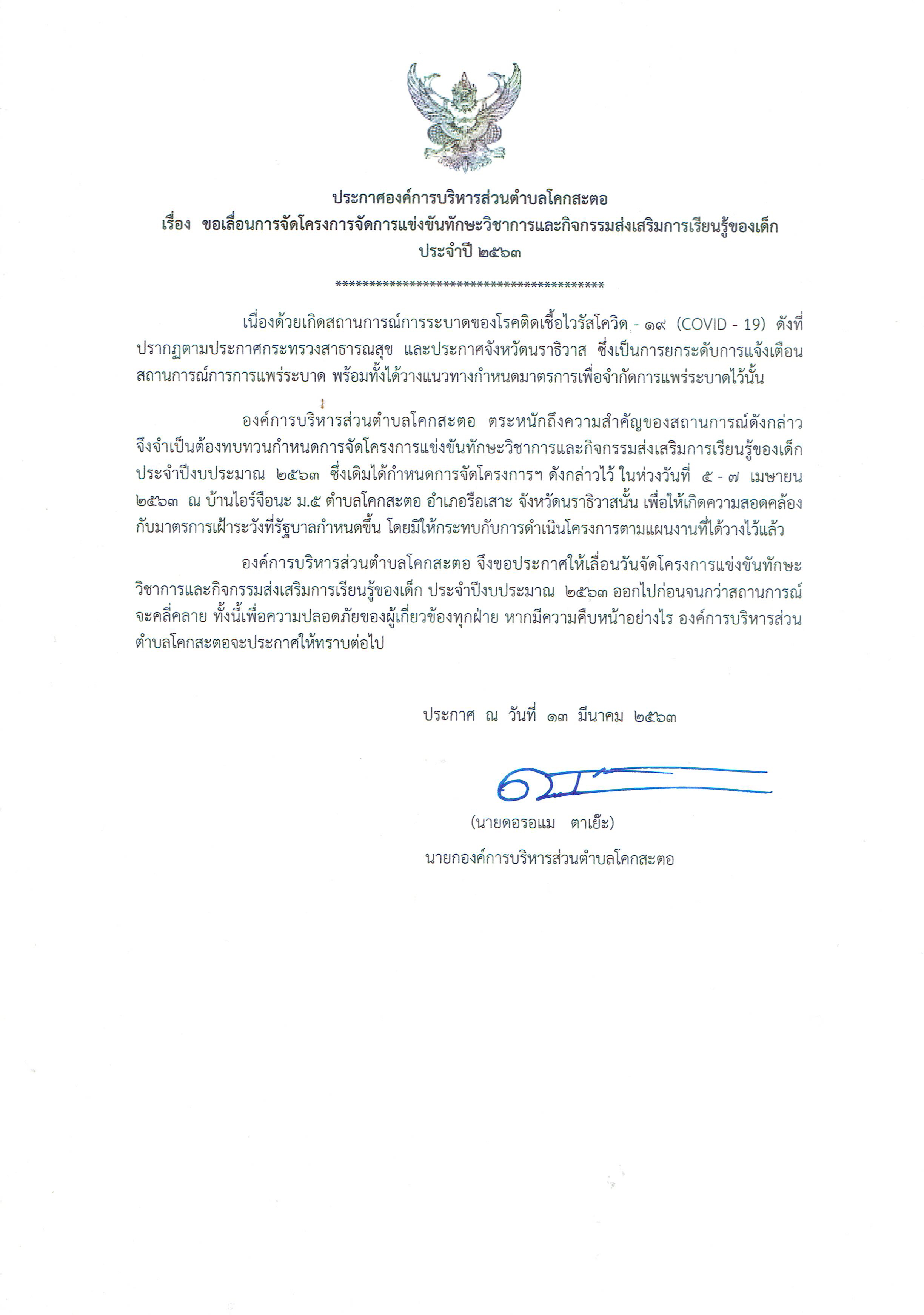 ประกาศ ขอเลื่อนการจัดโครงการจัดการแข่งขันทักษะวิชาการและกิจกรรมส่งเสริมการเรียนรู้ของเด็ก